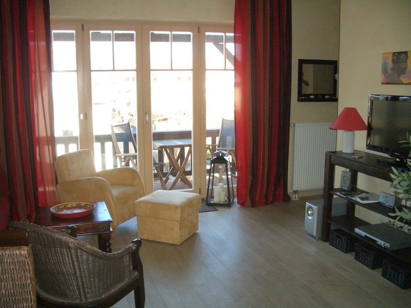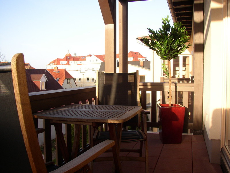 Vom Wohnzimmer aus gehen Sie auf den großen mit Gartenmöbeln ausgestatteten Balkon.