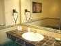 Das hochwertig ausgestattete Bad mit Marmorfliesen ist mit einer ebenerdigen Dusche, einem großzügigen Marmor-Waschtisch mit großem beleuchtetem Spiegel sowie einem